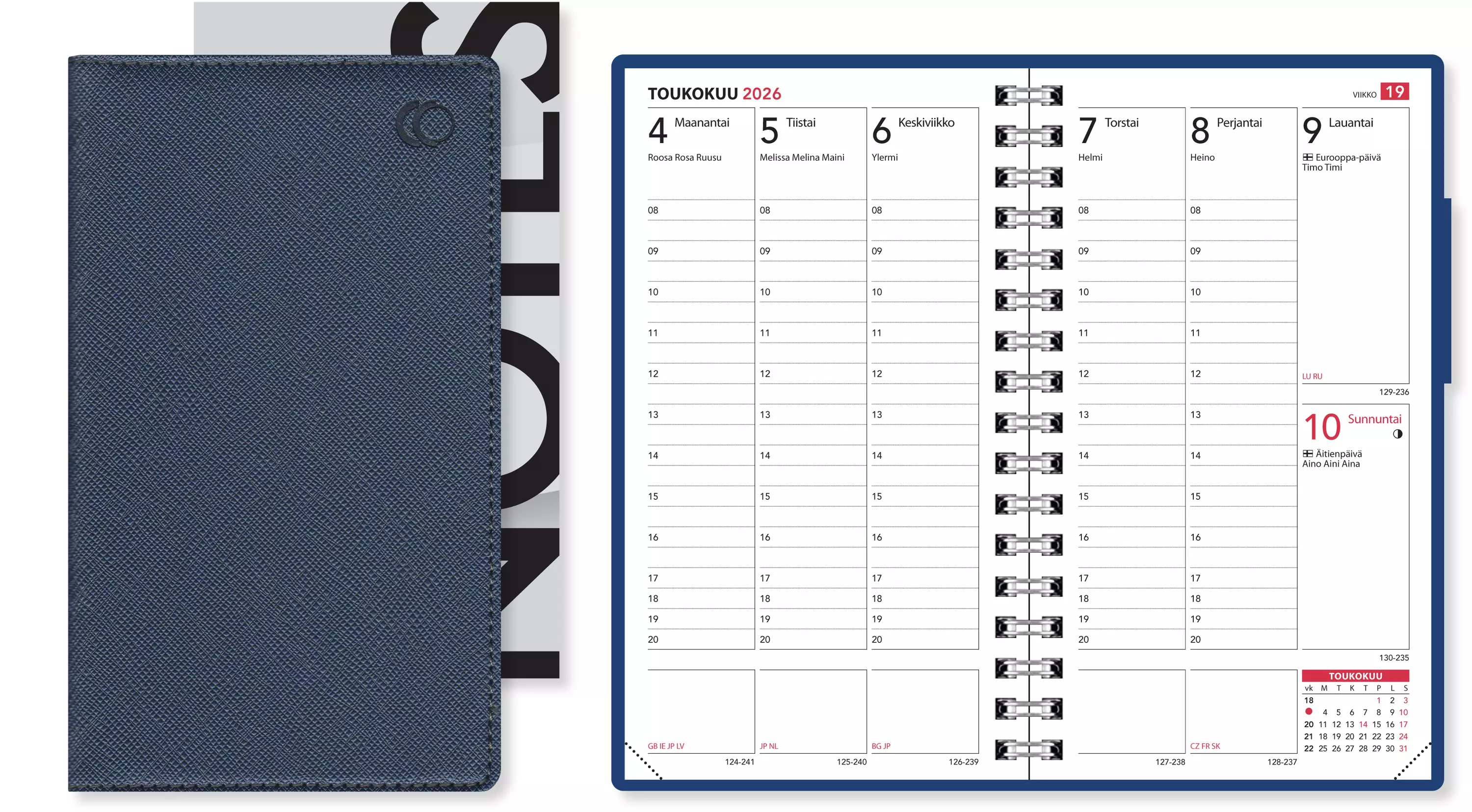 Selkeä ja tehokas Time-kalenteri tarjoaa runsaasti kirjoitustilaa. Pehmeissä laadukkaissa keinonahkakansissa on säilytystilaa vakkapa kuiteille. Koko 87 x 153 mm, viikot 50/2025-1/2027, vuosisuunnittelu 2026 ja laajennettu vuosi 2027, tehtäväluetteloita, infosivuja, muistiinpanosivuja. Aukeamalla viikko, tunnit 8-20, liputuspäivät, kansalliset pyhät aukeamilla ja luettelona, nimipäivät. Wiresidottu, kulmaperforoitu. Kynäholkki omalle kynälle. Suomenkielinen. Keinonahkakansissa on kalenterin lisäksi mukana myös siirrettävä Notes-muistio.