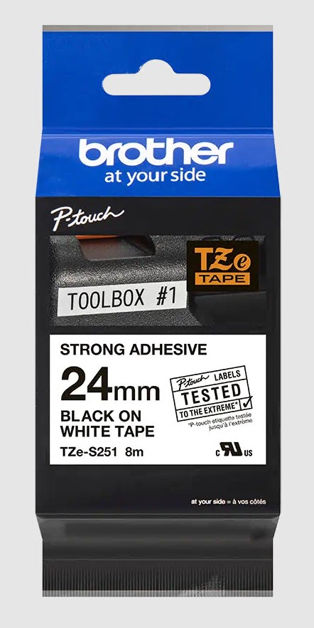 Musta teksti valkoisella teipillä. 24 mm. Laminoitu - 8 metriä. Erittäin vahva liima.