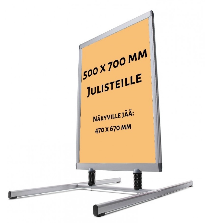 Metallijalat. Kaksipuoleinen. Sisä- ja ulkokäyttöön. Mainosta suojaava muovi, molemmin puolin. Muovissa UV-suoja sekä häikäisynestävä pinta - mainos ei haalistu auringonvalossa. Snaplistat suojaavat mainosta sateelta ja tuulelta. Ei teräviä kulmia. Mitat: Leveys: 620 mm. Korkeus: 979 mm. Pituus: 966 mm. Paino: 12,85 kg.