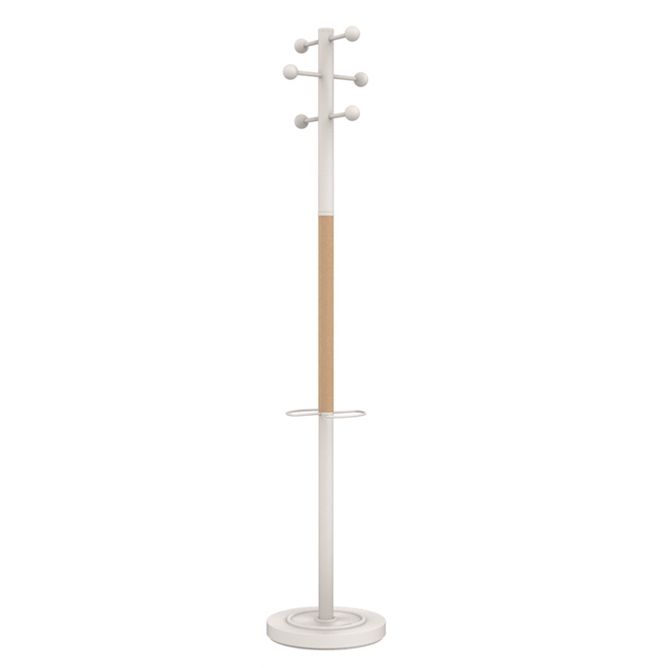 Vaatenaulakossa on 6 vaatekoukkua, jotka on sijoitettu lomittain estäen vaatteiden roikkumisen päällekäin. Materiaali on korkealaatuista epoksimaalattua terästä, pyökkinen tehoste varressa. Sateenvarjoteline ja tippa-astia. Helppo kasata. 4 kg painava jalusta pitää naulakon vakaana.