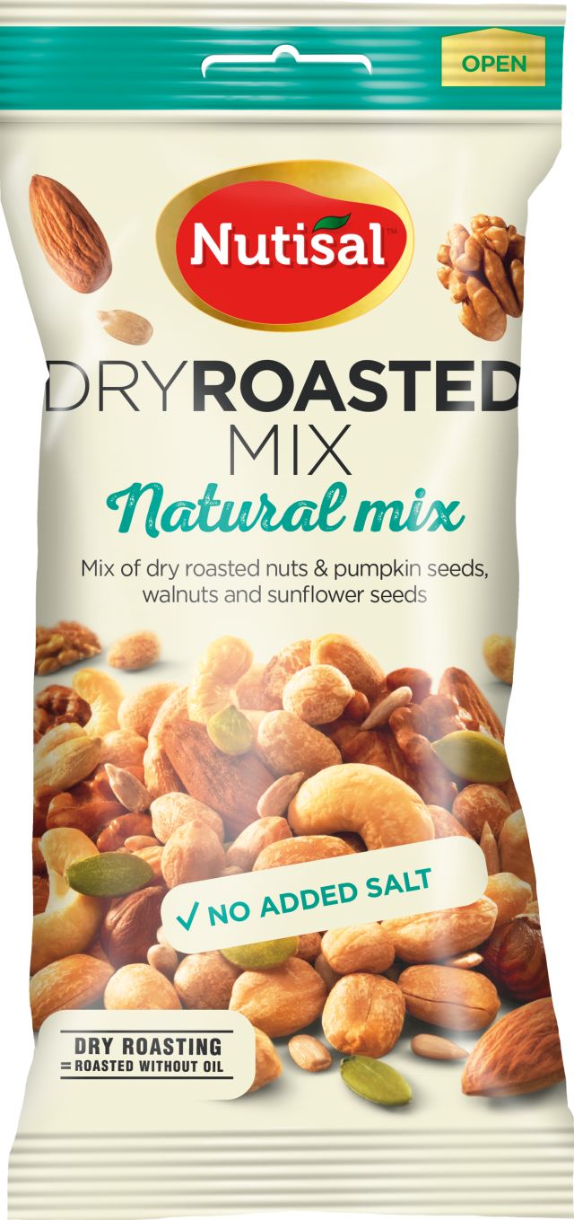 Välipalapähkinät ja hedelmät Nutisal Natural mixNutisal Natural Mix on suolaamaton sekoitus paahtamattomia sekä kevyesti paahdettuja pähkinöitä ja siemeniä.Sisäl- tää cashew-, maa-, saksan- ja hasselpähkinöitä, manteleita, auringonkukan- ja kurpitsansiemeniä.