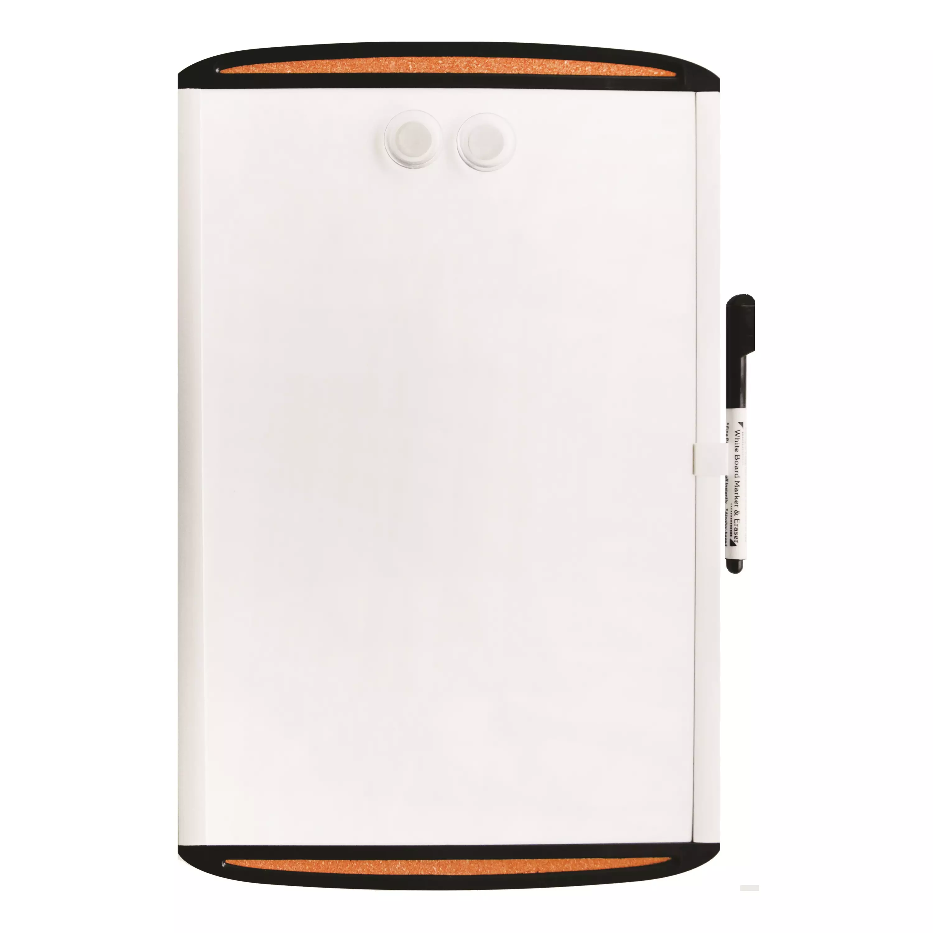 Magneettinen valkotaulu, jossa korkkitaulukaistaleet ylä- ja alareunassa. Pakkaus sisältää yhden valkotaulukynän ja pyyhkijän, kaksi magneettia sekä asennussarjan.