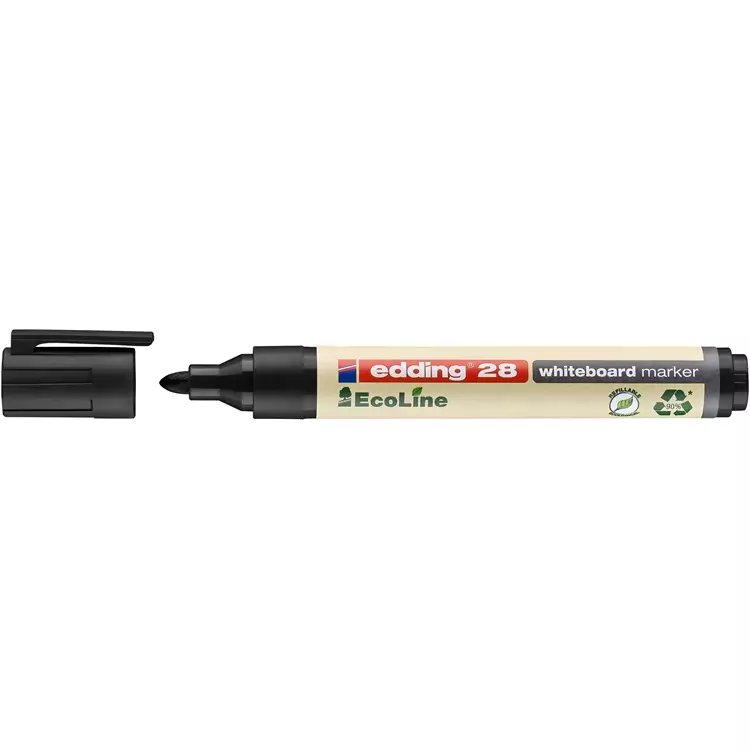 Edding 28 Ecoline on valkotaulukynä, jonka runko ja muut muoviosat on valmistettu vähintään 90-prosenttisesti kierrätysmateriaalista. Miedosti tuoksuva, valoa kestävä ja nopeasti kuivuva pigmenttimuste on kuivapyyhittävänä helppo pyyhkiä niin emali-, lasi- kuin melamiinipintaisilta valkotauluiltakin. Kynä ei kuivu, vaikka taskuklipsillä varustettu suojakorkki jäisi auki päiviksi. Korkki ja nuppi ovat musteen väriset. Kynän mustesäiliö on täytettävissä ja saatavilla on jopa vaihtokärkiä. Musteen väri: musta Kärki: pyöreä Viivan leveys: 1,5-3 mm