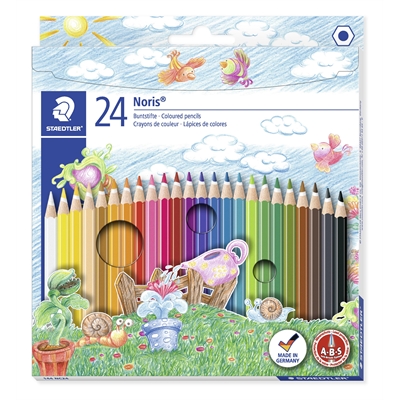 Pahvilaatikko, jossa on 24 värikynää eri väreissä. Täydellinen värillinen kuusikulmainen kynä - Valmistettu kierrätetystä puusta. Pehmeä liukumaton pinta ja korkea murtolujuus takaavat värjäyshauskan ilman hoitoa. Houkutteleva Noris-raitadesign.
