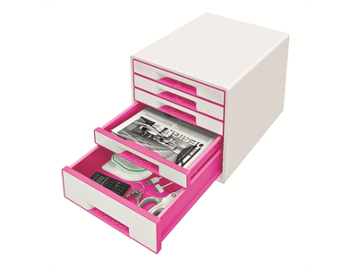 Laatikosto Leitz Wow valkoinen/pinkkiLeitz WOW-sarjaan kuuluva 5-osainen Cube-vetolaatikosto, jossa on stoppareilla varustetut, hyvin liukuvat laatikot. Laatikostossa on 1 iso laatikko esim.nitojille, lävistäjille ym. isommille tavaroille. Laatikostossa on 4 pienempää laatikkoa esim. kirjoitusvälineille, papereille.Materiaali on kestävää polystyreeniä ja mukana tulee lokerikko, etiketit ja kynä.Koko L287xK270xS363 mm.Upeissa Leitz WOW-väreissä on saatavana myös mapit, kulmalukkokansiot, nitojat, lävistäjät, lokerikkolaatikot, lehtikotelot, lomakelaatikot ja paperikorit.