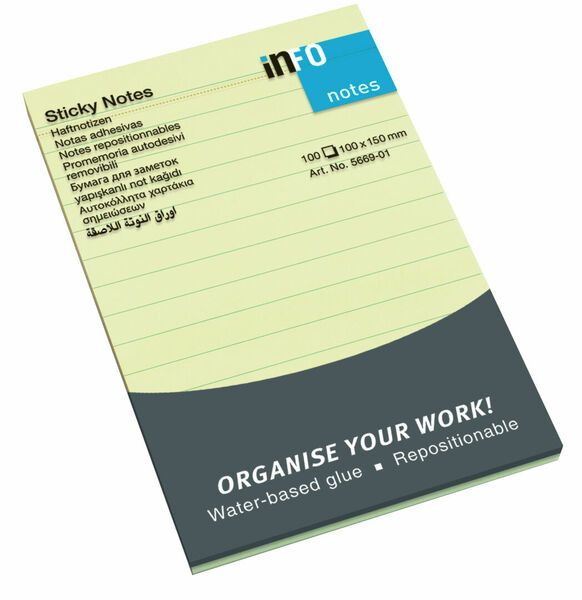 Iso viivattu keltainen muistilappu viesteille, jotka merkitsevät. Koko 100x150mm. 100kpl/nide.