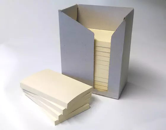 100-prosenttisesti kierrätyspaperista valmistettu viestilappu värjäämättömässä ja valkaisemattomassa kierrätyskartonkipakkauksessa. Muovittomuus on otettu tosissaan, sillä edes pakkauksen tai lehtiöiden ympärillä ei ole muovikelmua.