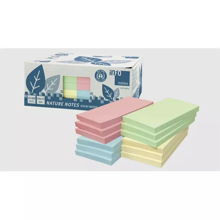 Info Nature -viestilaput on valmistettu 100-prosenttisesti kierrätyspaperista ja pakattu valkaisemattomasta ja värjäämättömästä kierrätyspahvista valmistettuun rasiaan. Myös liima on vesipohjaista. Ympäristöystävällisellä tuotteella onkin Blue Angel -ympäristösertifikaatti. Mitat: 75 x 125 mm Lappuja lehtiössä: 100 kpl Väri: pastellivärilajitelma (keltainen, sininen, punainen ja vihreä) Myyntierässä on 12 lehtiötä, kolme kutakin väriä. Yhteensä 1200 viestilappua.