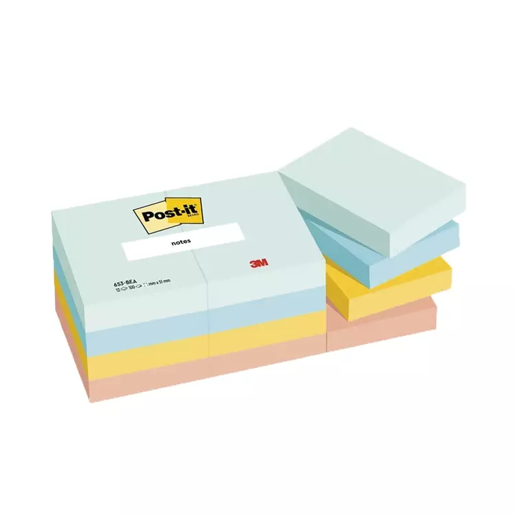 Post-it Beachside -viestilaput ovat levollisen pastellisävyinen versio vuosikymmeniä ikäisestä työpaikkojen klassikosta. Viestilappu on näppärä paikka kirjoittaa muistiinpanoja, lähettää viestejä ja koota ajatuksia. Post-it -viestilaput valmistetaan PEFC-sertifioidusta materiaalista. Laput on pakattu kierrätyspahvista valmistettuun säilytysrasiaan. Mitat: 38 x 51 mm Lappuja lehtiössä: 100 kpl Väri: Beachside-värilajitelma (mintunvihreä, turkoosi, oranssi ja koralli) Paketissa on 12 lehtiötä, kolme kutakin väriä. Yhteensä 1200 viestilappua.