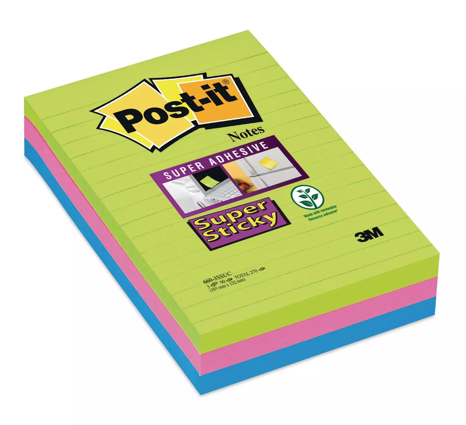 Post-It T660UC 102x152 viiv Super Sticky/3Viivoitettu viestilappu, joka kiinnittyy lähes kaikille pinnoille. Voit käyttää viestilappua esim. tehtävä- ja tarkastuslistana. Kirkkaat värit kiinnittävät huomion. 3 värin lajitelma (1 x lime, 1 x fuksia ja 1 x turkoosi). 90 lappua lehtiössä.