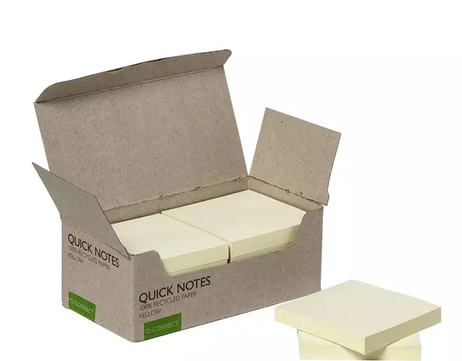 Viestilappu Q-Connect Eko 76x76mm keltainen 12 nidettä, KF17321. Valmistettu 100-prosenttisesti uusiopaperista. Pakkaus valkaisematonta ja värjäämätötä uusiokartonkia. Pakkauksen ja viesilappuniteen ympärillä ei ole muovikelmua. Pakkauksessa keltaisia niteitä. 100 lappua niteessä.