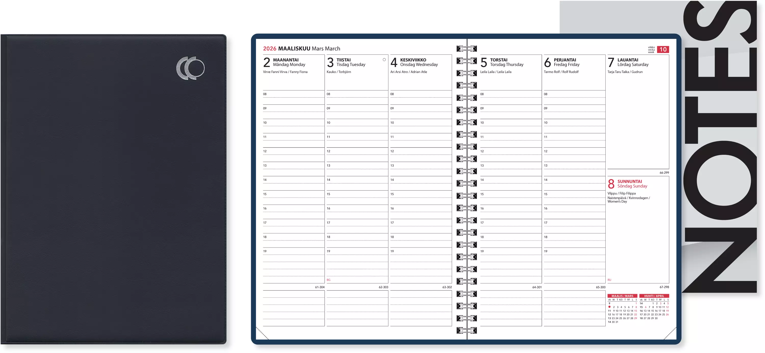 Kalenteri on A5-kokoinen, viikot 49/2025-1/2027, vuosisuunnittelu 2026 ja vuosi 2027 laajana, projektisuunnittelu. Aukeamalla viikko, tunnit 8-19. Yleiskalendaario, liputuspäivät, kansalliset pyhät ja nimipäivät aukeamilla sekä myös luettelona. Infosivuja, tehtäväruudukko, tehtäväluettelot, syntymäpäivä- ja lahjalistasivu sekä vuosikalenterit 2027-2030. Aukeamilla kahden kuukauden seuranta, runsaasti päiväkohtaista muistiinpanotilaa. Wiresidottu, kulmaperforoitu. Siirrettävä Notes-muistio. Tukevat siniset kannet kestävät myös monivuotista käyttöä. Kieliasu suomi, ruotsi ja englanti.