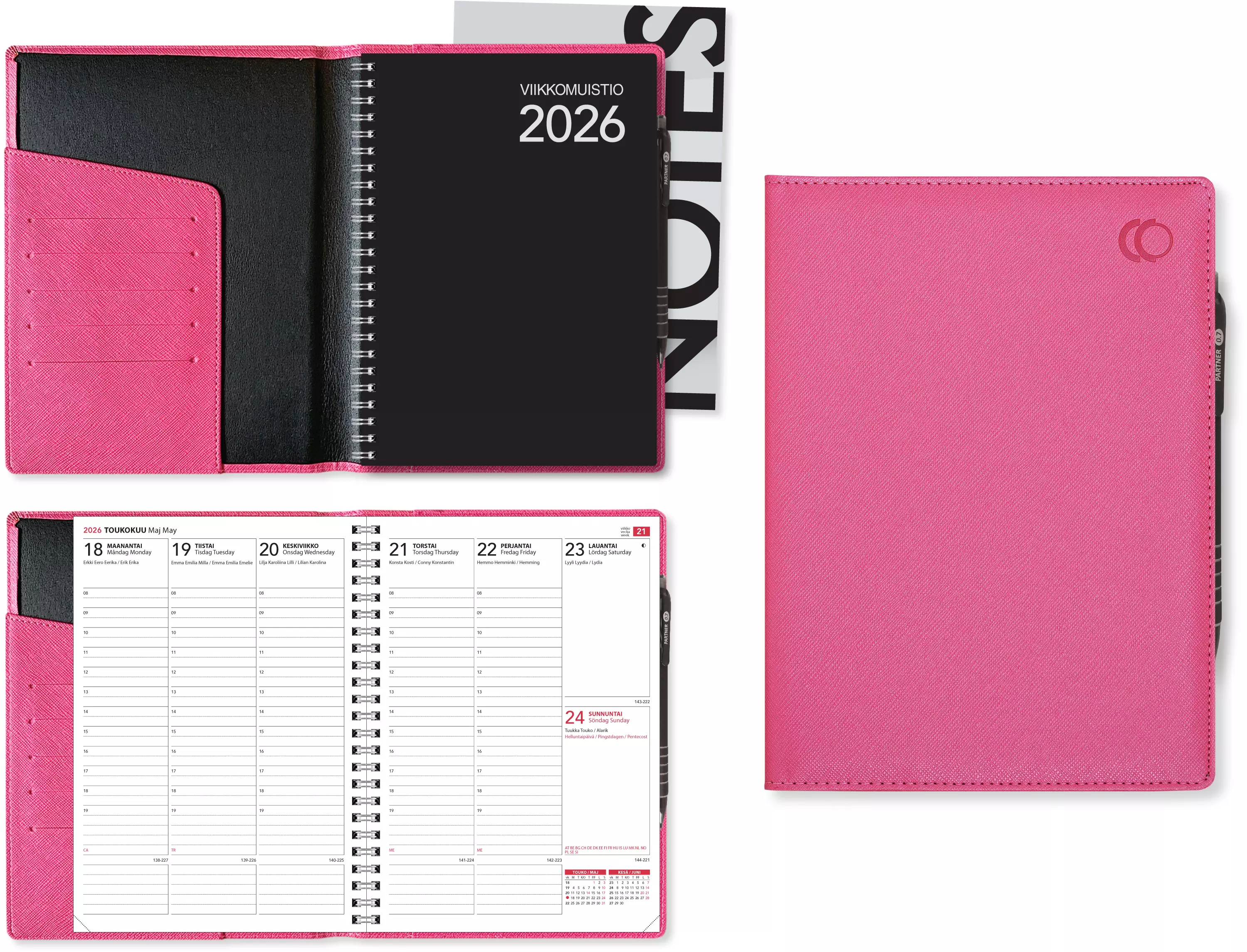 Klassinen A5-kokoinen kalenteri, viikot 49/2025-1/2027, vuosisuunnittelu 2026 ja vuosi 2027 laajana, projektisuunnittelu. Aukeamalla viikko, tunnit 8-19. Yleiskalendaario, liputuspäivät, kansalliset pyhät ja nimipäivät aukeamilla ja luettelona. Infosivuja, tehtäväruudukko, tehtäväluettelot, syntymäpäivä- ja lahjalistasivu sekä vuosikalenterit 2027-2030. Aukeamilla myös kahden kuukauden seuranta. Runsaasti päiväkohtaista muistiinpanotilaa. Wiresidottu, kulmaperforoitu. Laadukkaat ja pehmeät Siena-keinonahkakannet, joissa on erilaisia käteviä taskuja papereille, kuiteille ja korteille. Kansissa on lisäksi lyijytäytekynä ja siirrettävä Notes-muistio. Kieliasu suomi, ruotsi ja englanti. Kannet sisältävät kalenterin.
