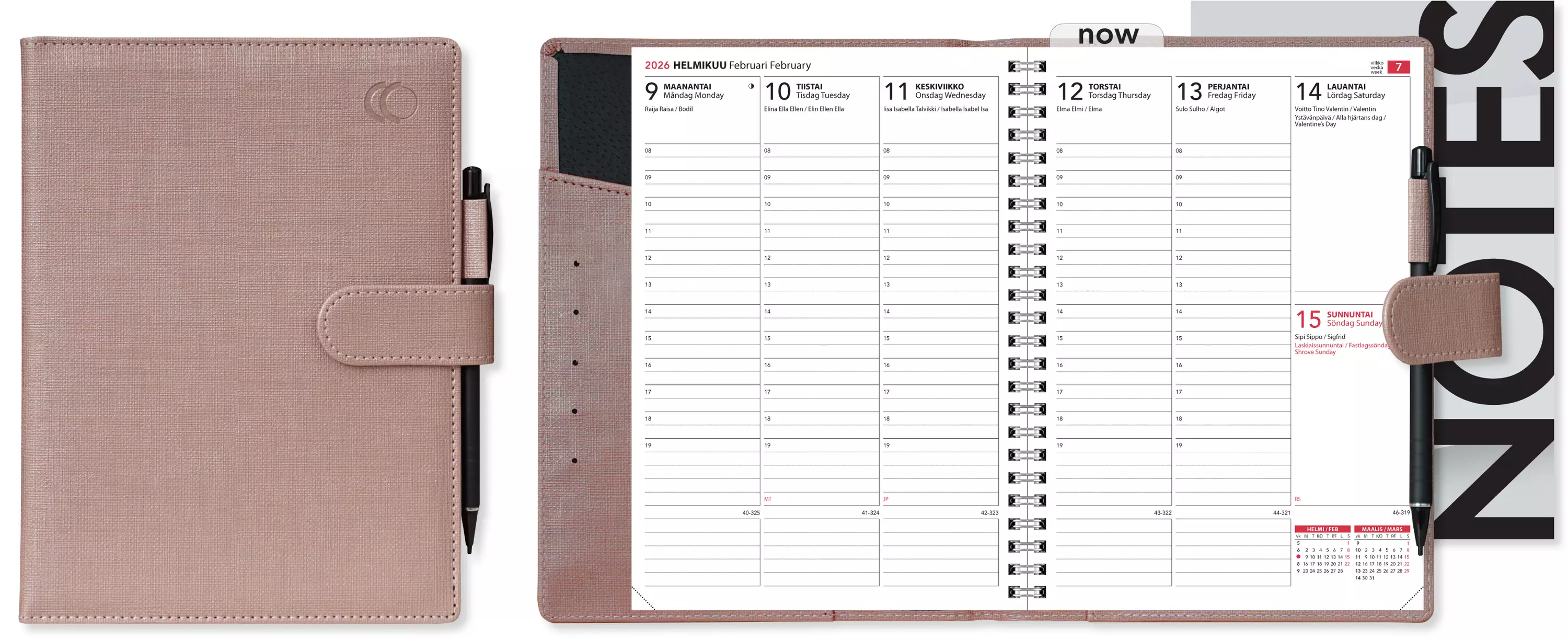 Tyylikäs ruusukultainen Viikkomuistio Premium on korkealuokkaisista materiaaleista valmistettu A5-kokoinen kalenteri. Pehmustettu ja kestävä Kioto-keinonahkakansi säilytystaskuilla, läppäkiinnityksellä ja lyijytäytekynällä tekee päivittäisestä käytöstä vaivatonta. Kansiin pujotettu siirrettävä Notes-muistio kulkee tarvittaessa mukanasi kalenterista kalenteriin. Kalenteriosassa on myös kätevä siirrettävä viikko-osoitin. Kannet sisältävät kalenterin ja seuraavana vuonna tarvitset vain Viikkomuistio-vuosipaketin.A5-kokoisessa kalenteriosassa viikot 49/2025-1/2027, vuosisuunnittelu 2026 ja vuosi 2027 laajana, projektisuunnittelu. Aukeamalla viikko, tunnit 8-19. Yleiskalendaario, liputuspäivät, kansalliset pyhät ja nimipäivät aukeamilla sekä myös luettelona. Infosivuja, tehtäväruudukko, tehtäväluettelot, syntymäpäivä- ja lahjalistasivu sekä vuosikalenterit 2027-2030. Aukeamilla myös kahden kuukauden seuranta. Runsaasti päiväkohtaista muistiinpanotilaa. Wiresidottu, kulmaperforoitu, kätevä siirrettävä viikko-osoitin. Kieliasu suomi, ruotsi ja englanti.