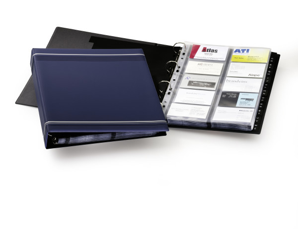 Käytännöllinen käyntikorttialbumi, jossa on 20 läpinäkyvää polypropeenitaskua 400 käyntikortille ja 4 rengasrekisteröintimekanismia ja 12 kappaleen hakemisto.