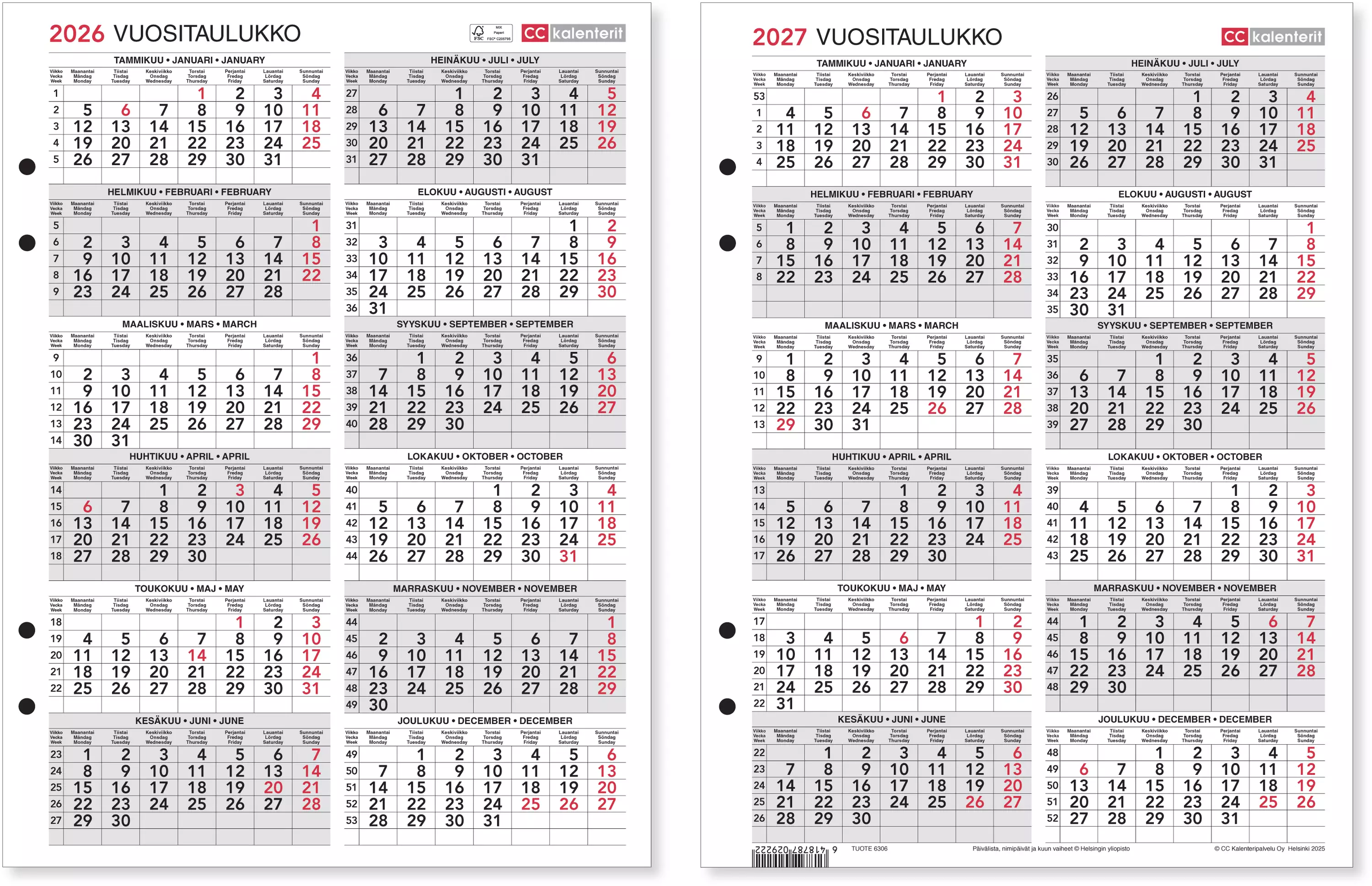 Koko 224 x 297 mm, kahden vuoden taulukkokalenteri, mappirei’itys, tukevaa mattakartonkia. Kieliasu suomi, ruotsi ja englanti.