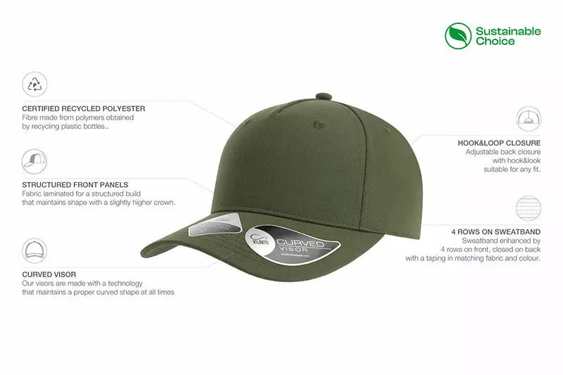 200GSM. Curved visor lipan muovi, etupaneelin kovike ja hikinauha kierrätysmateriaaleista.