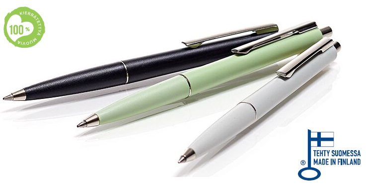Klassinen laatukynä, jolla kirjoitat yli 10.000 metriä. Hopean väriset meralliosat ja suuri laatusäiliö. 100% Kierrätettyä muovia.